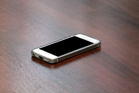 Mobile phone resting on a wooden table. lost smart phone concept