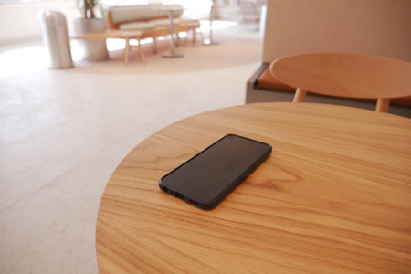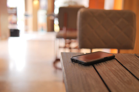 Smartphone on wooden table in coffee shop with bokeh background