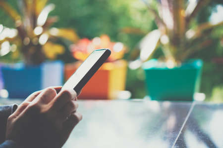Woman hand using smartphone with cafe shop colorful beautiful bokeh background. Business, financial, trade stock maket and social network concept.