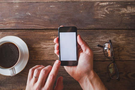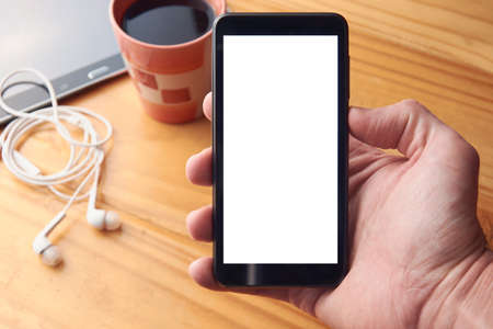 Modern black mobile phone in hand of young adult man showing blank screen against blurry background with coffee cup, earphones and tablet on wooden table.