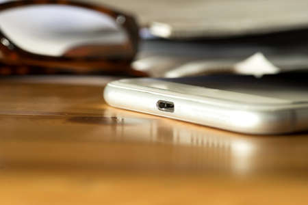 Close up shot of a smart phone on a wooden table, with shallow depth of field.