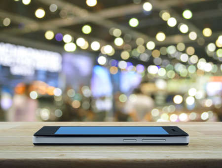 Modern smart phone with blank blue screen on wooden table in front of blur light and shadow of shopping mall