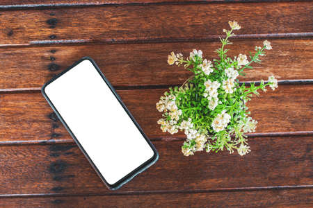 Smartphone with Mockup image white screen On Wooden Table With beautiful patterns And copy space for adding content. Smartphone concept and lifestyle. Have clipping path