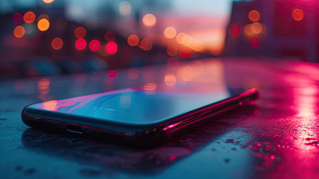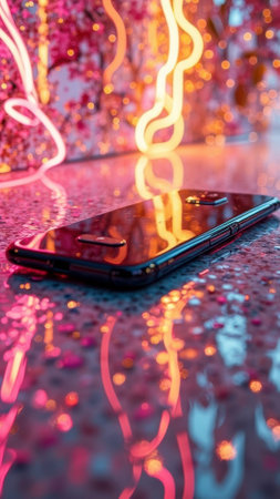 A sleek smartphone rests on a textured surface, exhibiting colorful reflections and a vibrant atmosphere. Ideal for technology and lifestyle themes.