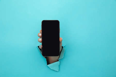 Hand holding mobile phone bursting through paper. Trend torn paper