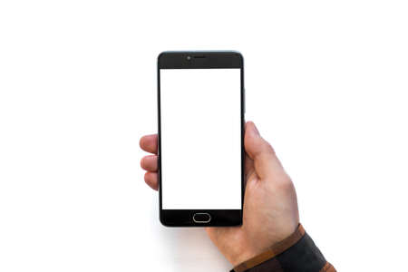 Hand holds black smartphone isolated on white background
