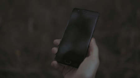 Mock up phone in man hand showing black screen on the background of the summer nature,taking a camera shot