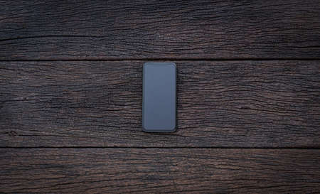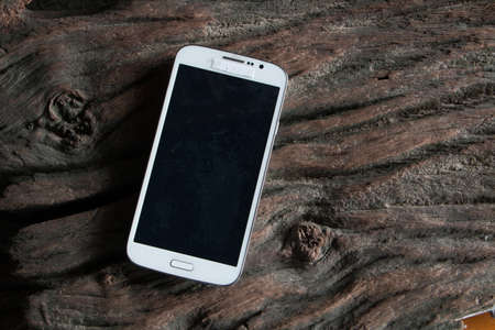 White smart phone with black screen on old wooden.