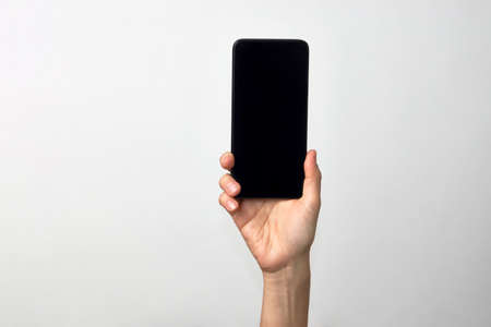 Woman hand holding phone on white background with copy space