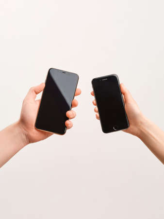 Smartphones of different generations with empty screens in the hands of a man and a woman close-up on a white background