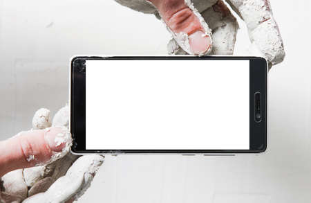 Mobile photography of home repair process. Advertisement or commercial for online building store. Builder hands in plaster with phone with blank screen