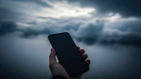 male hand holding smartphone on the background of the sky with clouds.