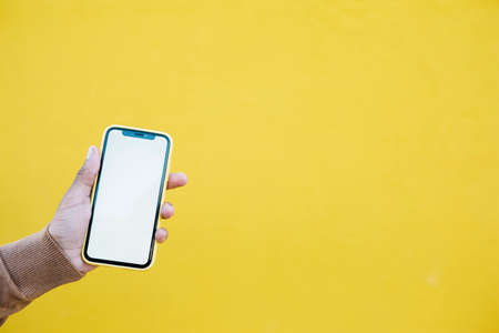 Hand of a latin american male holding a yellow smartphone against a yellow background