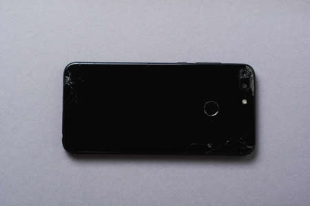 Modern black smartphone with broken panel and touch screen on gray background. Recycling concept.