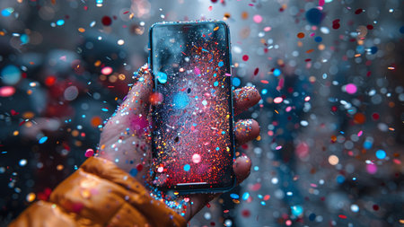 Close-up of a man's hand holding a smartphone with falling confetti.