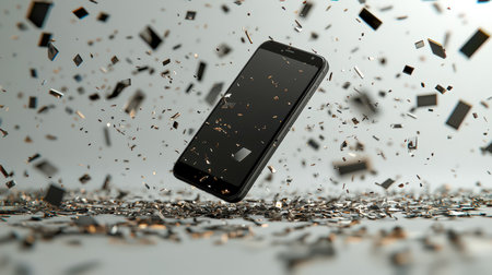 An urban scene capturing a smartphone slipping from grasping amid vibrant confetti, symbolizing tech mishaps during lively festivities.