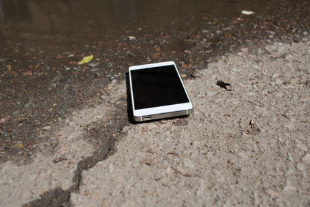 Mobile phone lying on pavement in puddle
