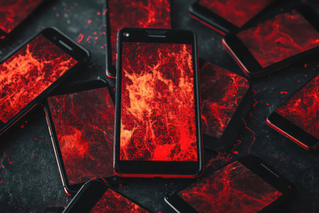 Several smartphones are arranged on a dark surface, each screen showcasing a vibrant fiery design.
