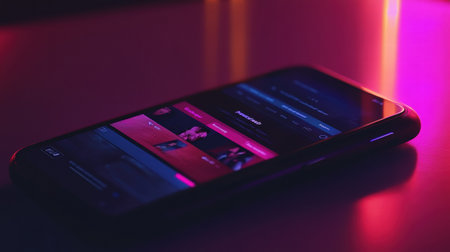 A smartphone rests on a surface, showing a colorful social media news feed illuminated by neon lights in a dark setting, suggesting evening time.