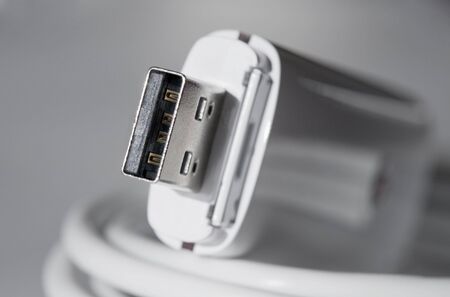 Studio lighting. usb wire for connecting to a computer in blue or purple on a wooden white background in retro style. Close-up.