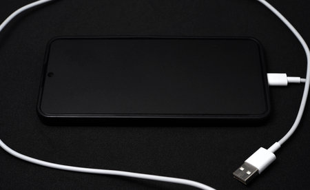 Black smartphone and connected white cable of charger. Mobile phone charging