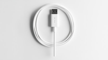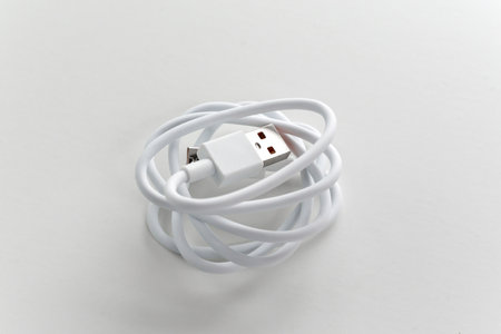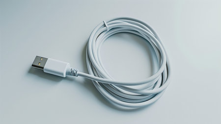 A sleek white USB cable elegantly arranged on a minimalistic background, illustrating themes of technology, charging, and digital connectivity in daily life.