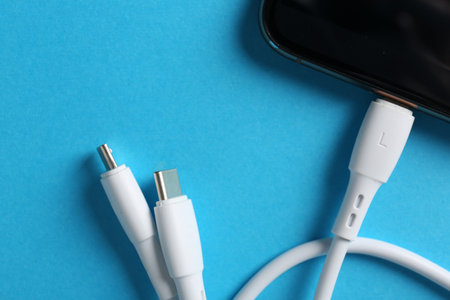 View from above of long USB-C Cable manufactured for fast data and peripheral transmission - isolated on blue background