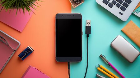 A top-down view of a smartphone charging from a portable power bank with a USB cable, placed on a desk with stationery around