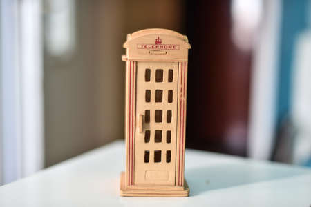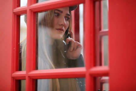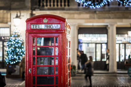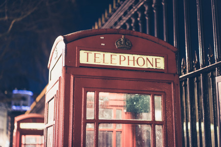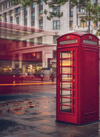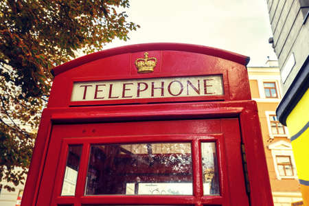 Old telephone in London, UK. Vintage telephone booth with red background.