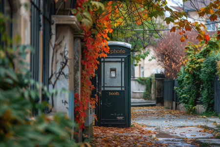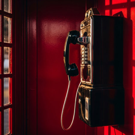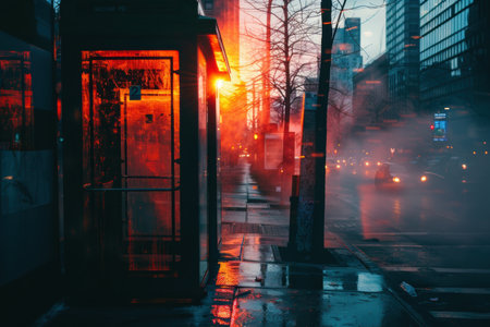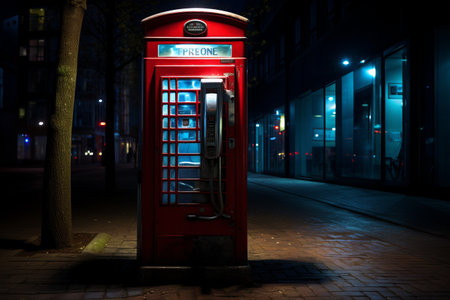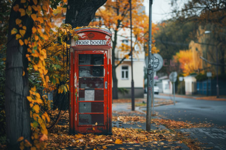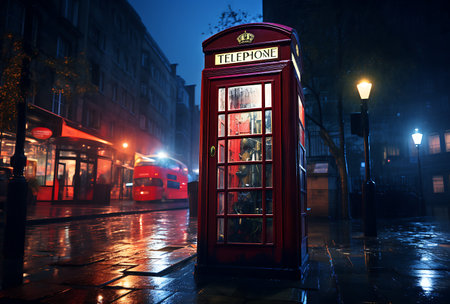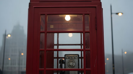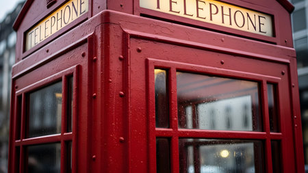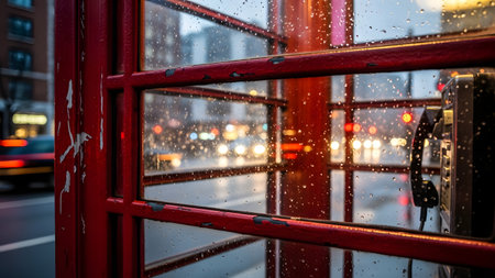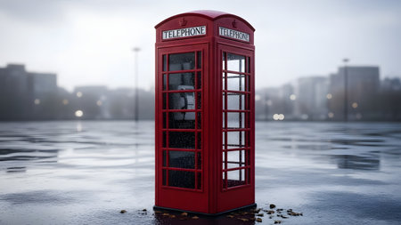Classic red phone booth on a rainy street, symbolizing nostalgia and communication.