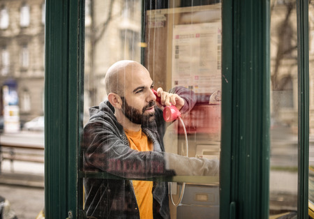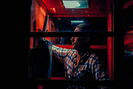 A man of criminal appearance in a payphone booth at night. Talking on the phone with a revolver and a cigarette.