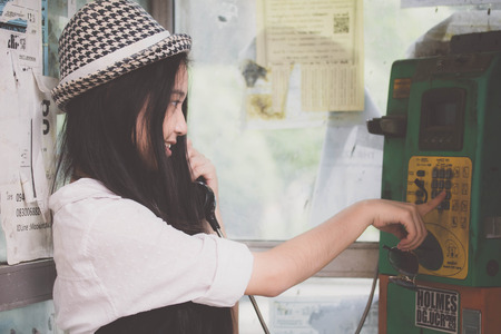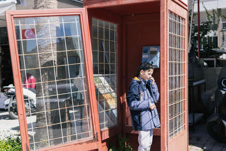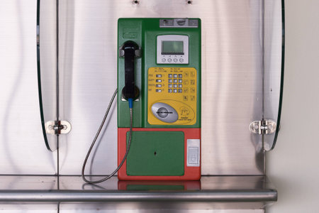 Chongqing, China - August 2019 : Public phone inside the red telephone booth
