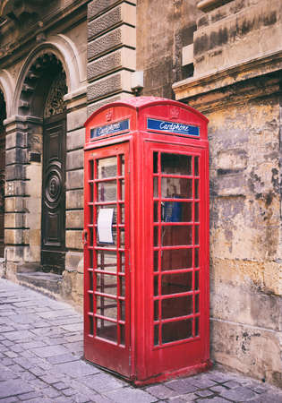 Red British vintage telephone booth outside of a sandstone facade building in Valletta, Malta