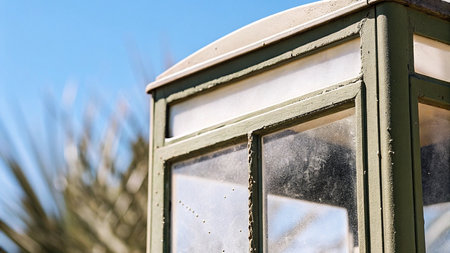 Close-up interior of an old phone booth with metallic phone, vertical shot
