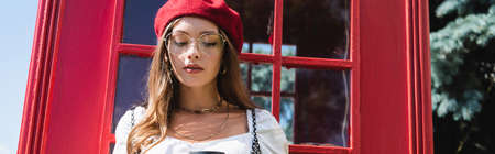 joyful woman in beret and eyeglasses near red phone booth, banner
