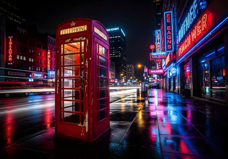 A red telephone booth stands out against the vibrant neon lights of a rainy london street at night, creating a classic urban scene