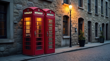 Two iconic red telephone booths stand side by side, warmly lit in a quiet cobblestone alley, surrounded by historic stone buildings.