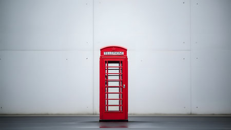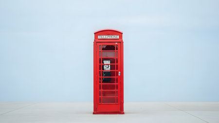 A classic bright red telephone booth stands isolated against a clean, pale blue sky and a minimalist concrete ground. The image represents traditional communication icons and British culture in a modern, minimalist style.