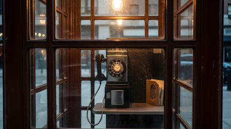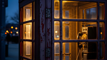 A view of a vintage rotary payphone inside a booth, seen through the grid of the glass window. The warm light inside contrasts with the cool urban tones of the night exterior.
