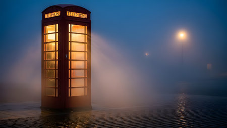 A classic red British telephone booth stands illuminated against a backdrop of thick fog and cobblestone streets at night. The atmospheric scene evokes a sense of mystery and vintage urban charm.