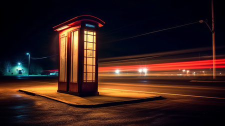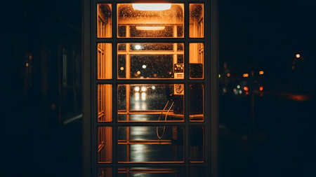 A nostalgic phone booth illuminated from within on a rainy night in the city. Raindrops streak the glass windows, creating a moody, cinematic atmosphere that evokes feelings of urban solitude and connection.