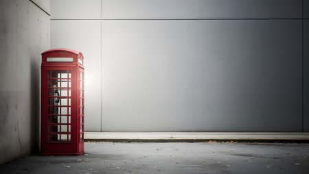 An iconic red British telephone booth stands in stark contrast against a minimalist grey concrete wall. This classic symbol of London features traditional grid windows and bright red paint, highlighting urban architectural design.