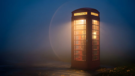 A classic red telephone booth glows warmly in a dark, foggy environment. The mist and dramatic lighting create a mysterious, cinematic atmosphere reminiscent of a London street at night.