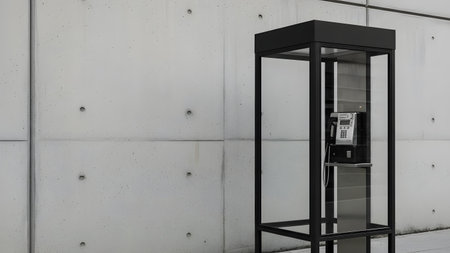 A modern, black-framed glass phone booth stands isolated against a large, textured concrete wall. The minimalist architectural style highlights geometric lines and a brutalist aesthetic.