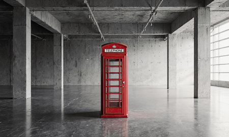 Phone Booth Anomaly. A classic, red telephone booth stands incongruously in the middle of a vast, empty modern warehouse