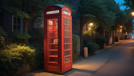 The red phone booth in the sidewalk of urban street. Generative AI.