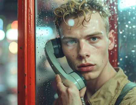 distressed young white male speaks urgently into phone amid pouring rain and cinematic evening