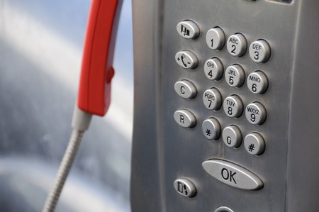 Public pay phone made of scratched metal with a pink handset, insert for coins and credit card, in Germany, copy space, selected focus