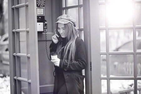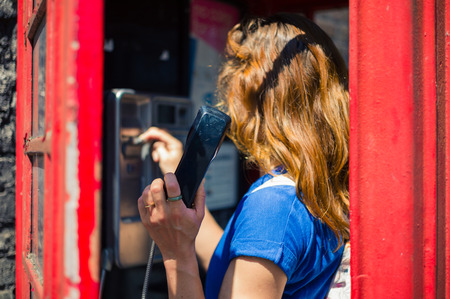 Beautiful young girl in a phone booth.