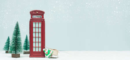 Banner with christmas decorations, toy red phone booth, trees, gifts on light background